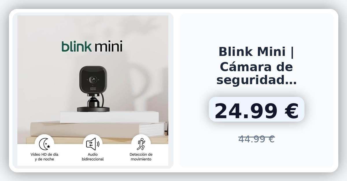 Mantén tu hogar protegido con la cámara de seguridad inteligente Blink Mini. Resolución HD 1080p, detección de movimiento y audio bidireccional para supervisar en tiempo real. Fácil instalación y configuración a través de la app. Compatible con Alexa para un control hands-free. Almacenamiento en la nube o local. ¡Todo lo que necesitas para una vigilancia completa en dos dispositivos compactos! 🇪🇸