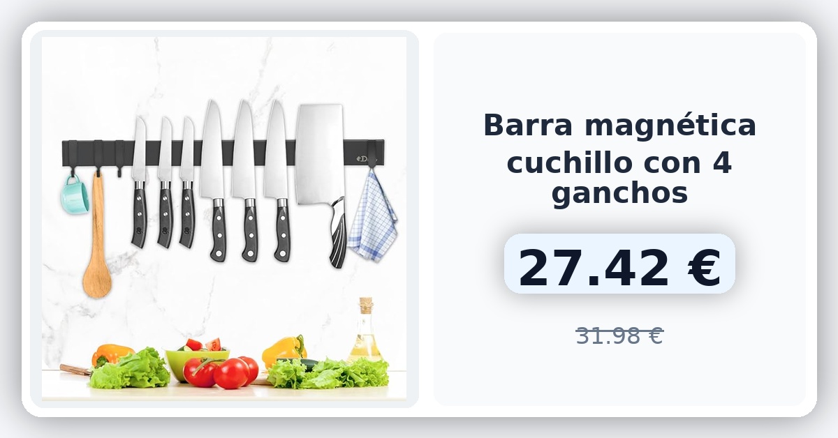 Barra magnética para cuchillos de acero inoxidable 304 con potente fuerza magnética. Su diseño multifuncional y opciones de instalación sin taladrar la hacen perfecta para mantener tu cocina, garaje o taller organizados. Ideal para regalar y con garantía de por vida. ¡Orden y seguridad en un solo producto! 🇪🇸