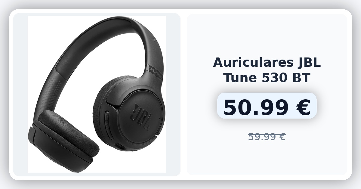 Disfruta de un sonido envolvente y potentes graves con los auriculares Tune 530BT de JBL. Con hasta 76 horas de autonomía y diseño plegable, podrás llevar tu música a todas partes con total comodidad. Personalízalos con la app JBL Headphones y sumérgete en una experiencia auditiva única. 🇪🇸