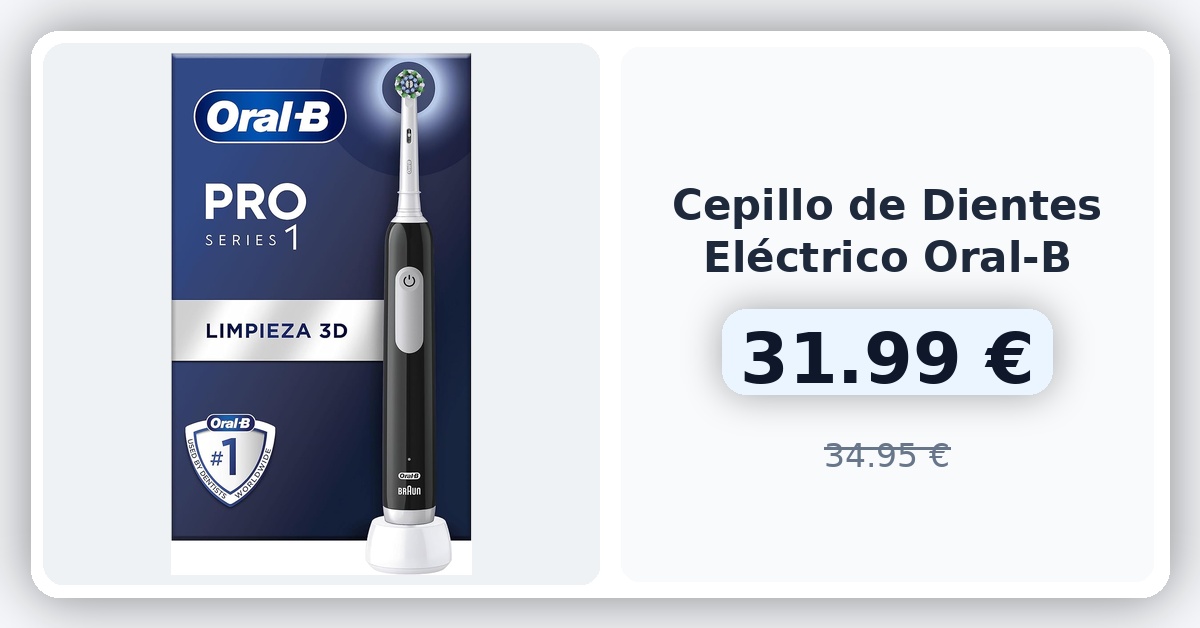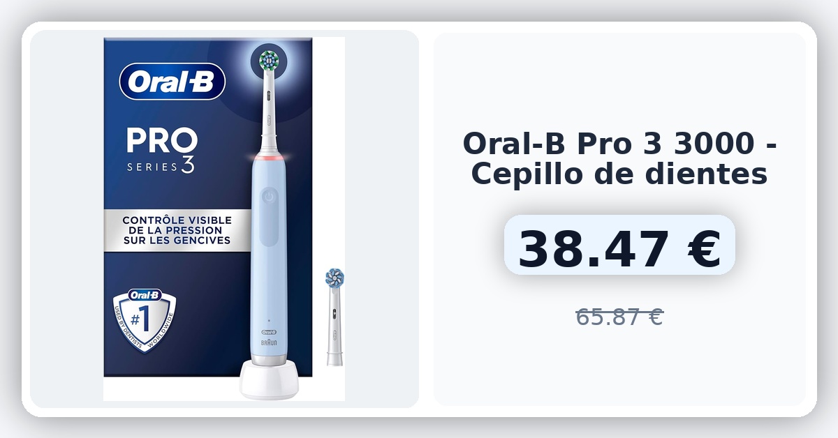 Descubre el cepillo de dientes eléctrico Oral-B Pro 3, recomendado por dentistas. Con temporizador y control de presión, limpia de forma profesional en 3 modos: diario, abrillantado y sensible. Elimina hasta un 100% más de placa que un cepillo manual, cuidando tus encías y proporcionando una limpieza profunda. ¡Mejora tu salud bucal con la tecnología de Oral-B! 🇪🇸