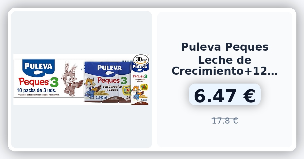 Leche de crecimiento Puleva Peques 3 con cereales y cacao, enriquecida con Omega 3 DHA, hierro y 13 vitaminas. Facilita el desarrollo cognitivo y físico del bebé, refuerza su sistema inmunológico y aporta nutrientes esenciales. Práctica y deliciosa opción para cuidar de la salud de tu hijo. 🇪🇸