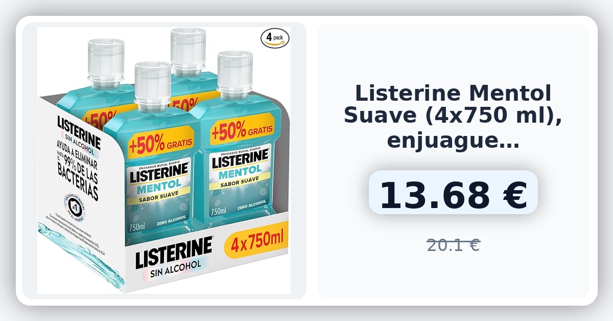 🌀 Listerine Mentol Sabor Suave (4x750 ml), enjuague bucal con flúor, colutorio encías con 24 h de protección y 0% alcohol, enjuague bucal sin alcohol para un aliento fresco 🇪🇸